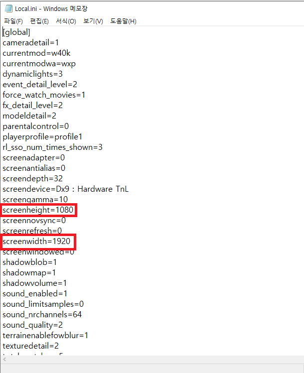 복사한 파일 중 Local.ini 파일을 메모장으로 열고 screenwidth 에는 본인 해상도의 가로 픽셀, screenheight 에는 해상도 세로 픽셀 수치를 입력하고 저장한다.